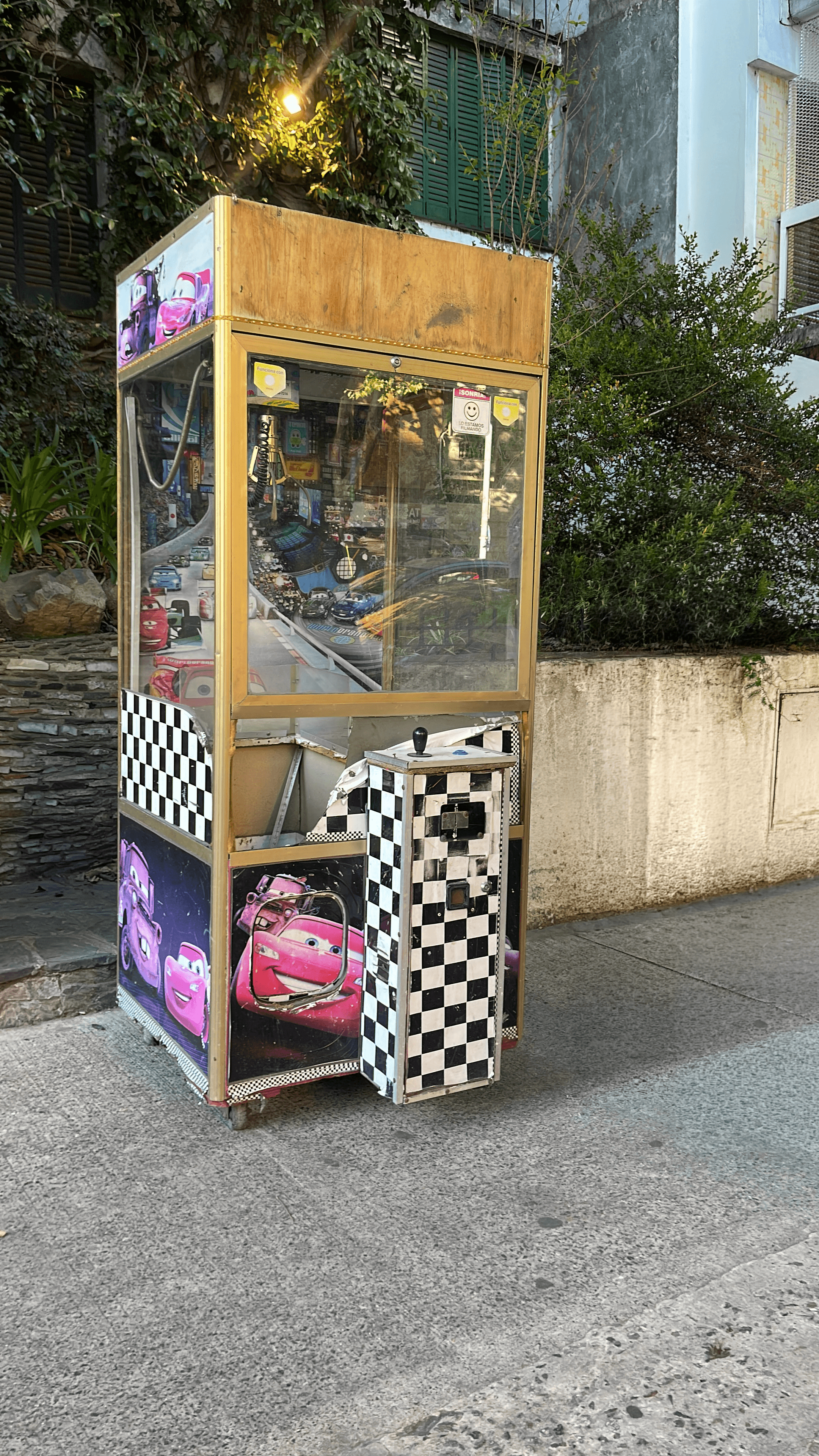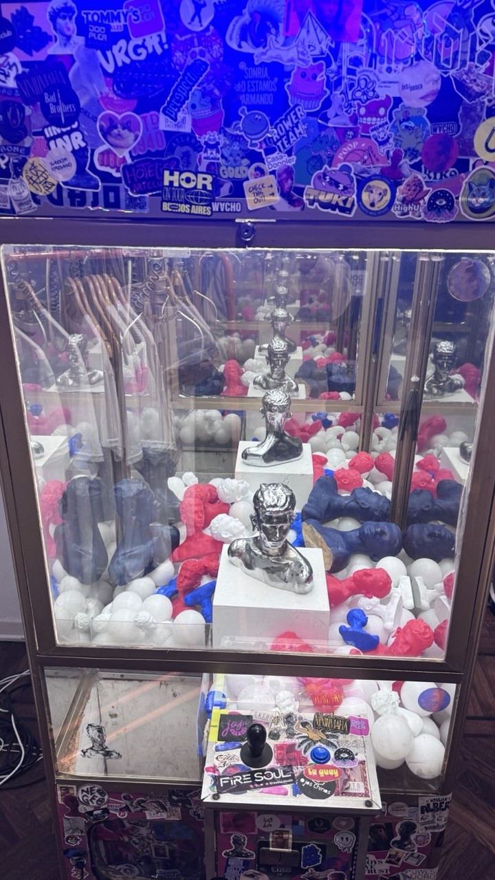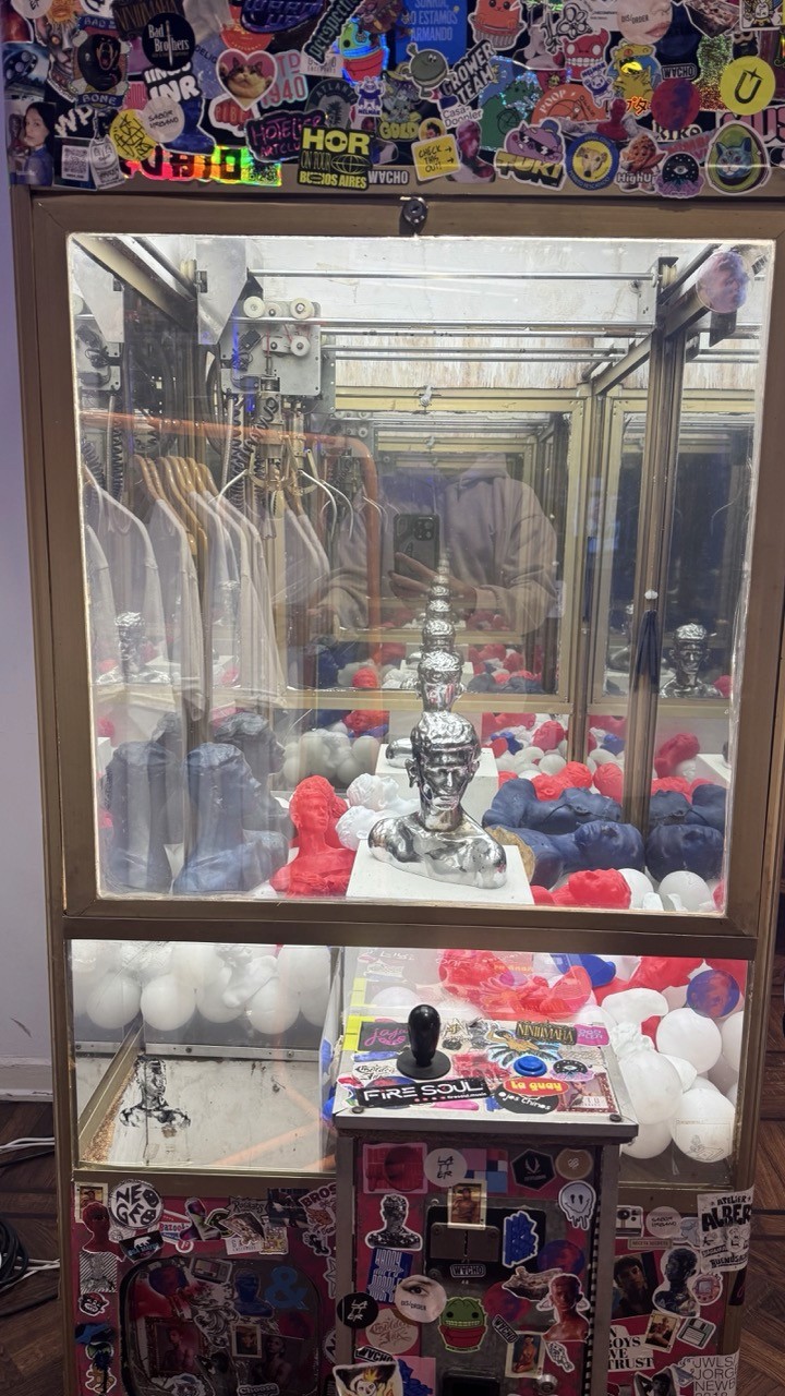 Las pelucheras de arcade devienen esculturas que interrogan la economía del deseo. El único premio posible es un FRANCO —bustos en rojo, azul y plateado— flotando entre pelotas espejadas que multiplican la imagen al infinito. Algunos son de metal macizo, otros de poliuretano: la ilusión de la recompensa valiosa. Intentás agarrar un rostro y se escapa. La máquina como crítica al deseo de posesión, al loop perpetuo del casi-gano, a la fantasía de acumulación bajo el capitalismo.