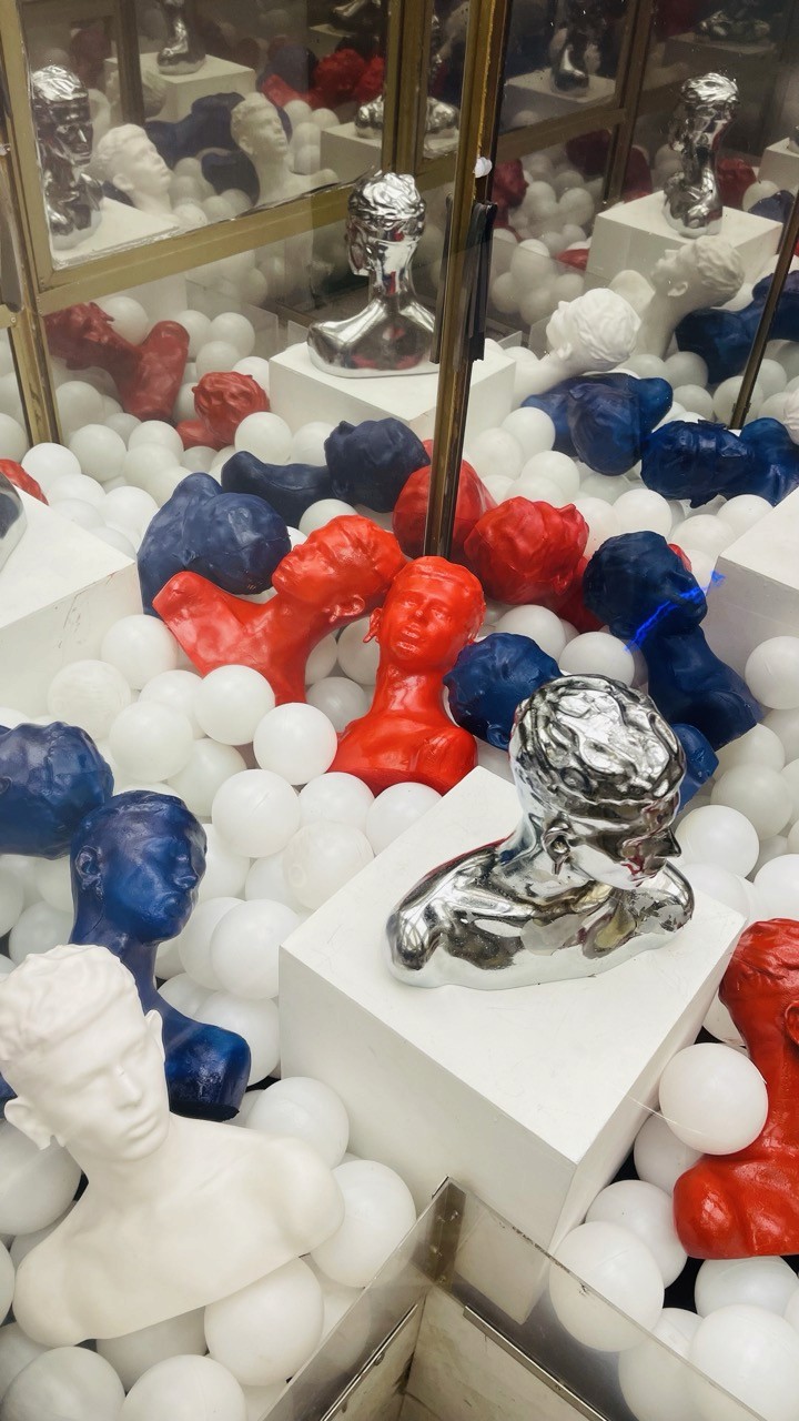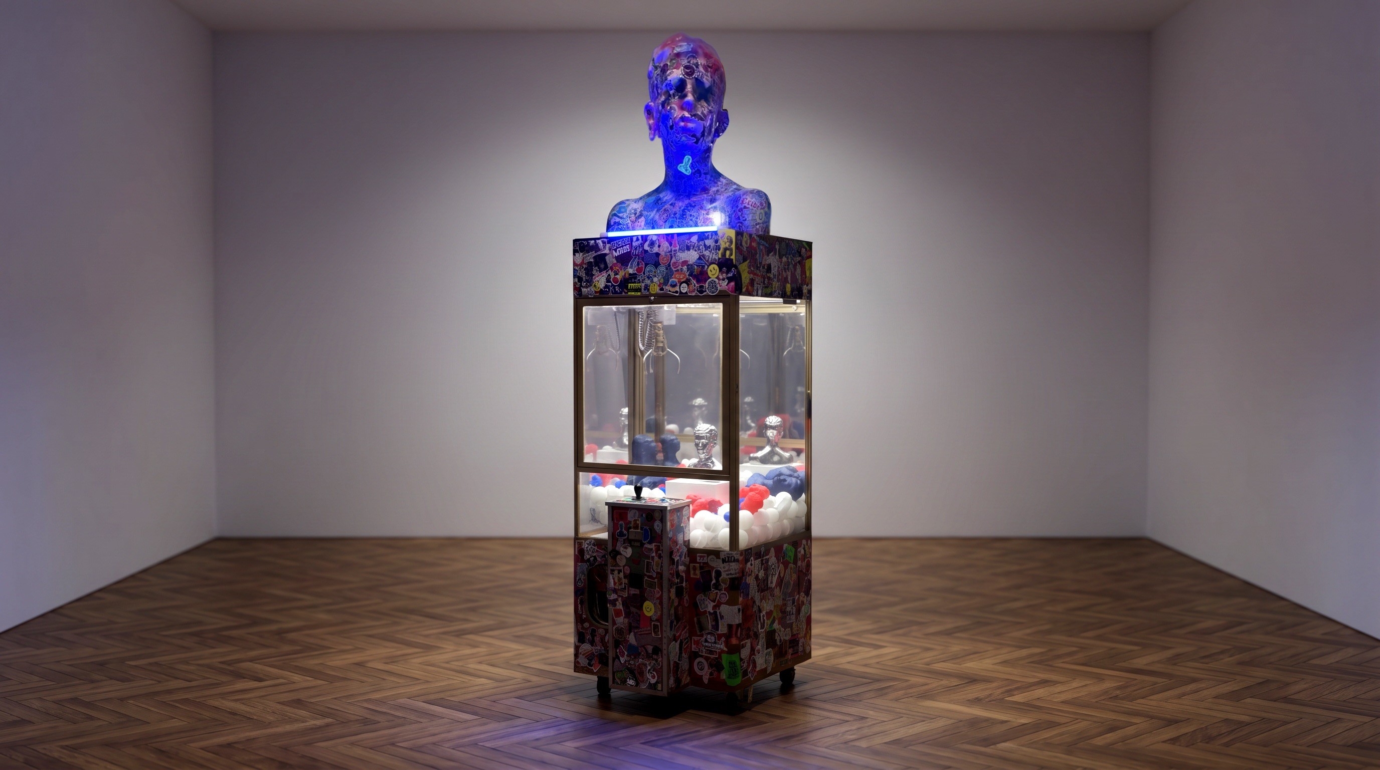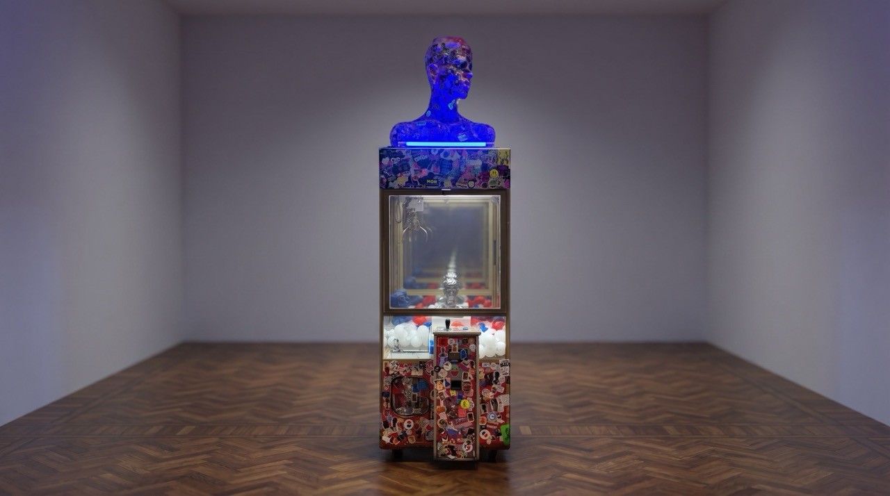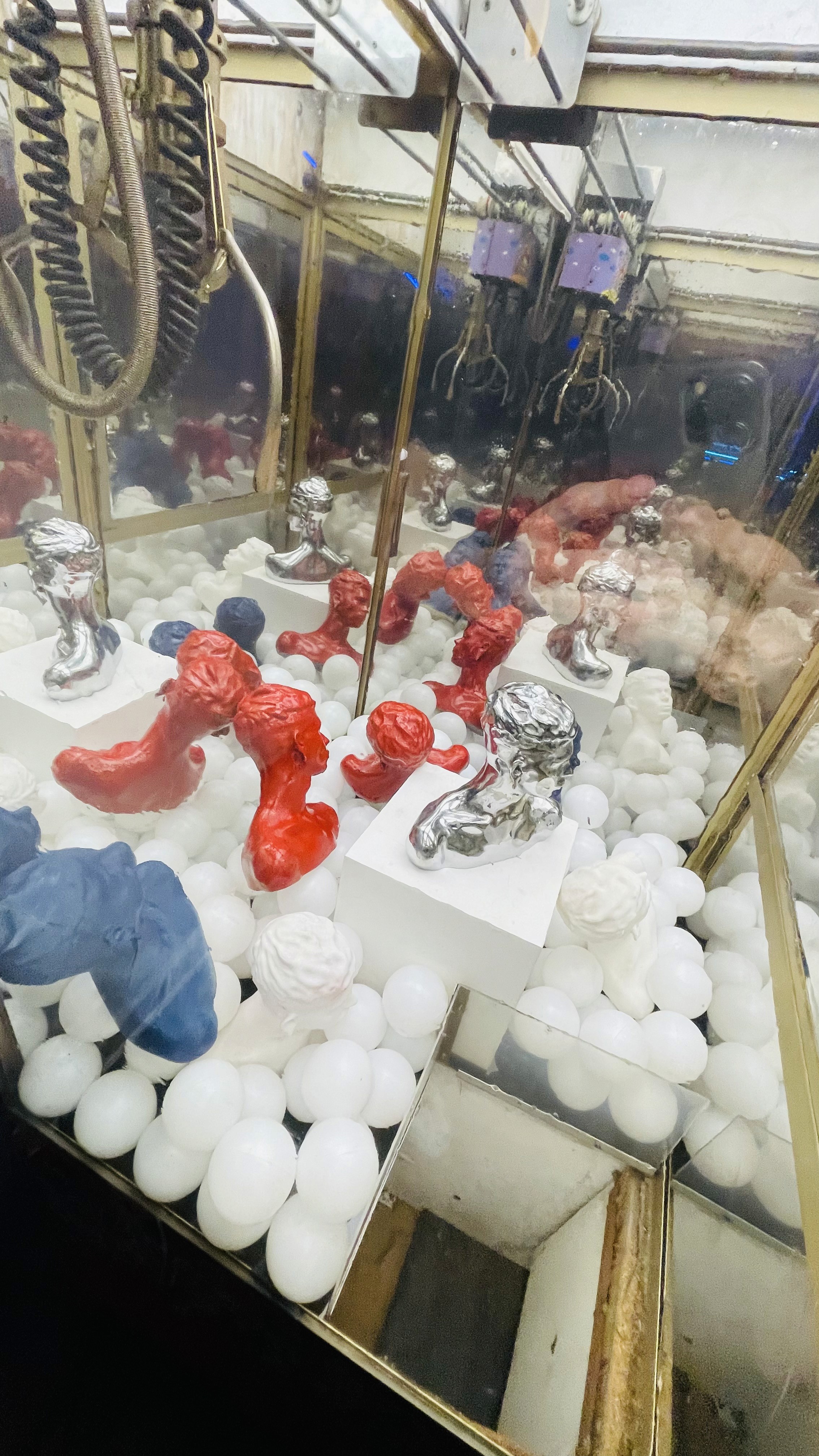 Intervened claw machines, metal and polyurethane busts, infinite mirrors