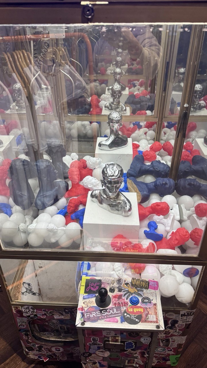 Arcade claw machines transformed into sculptures interrogating the economy of desire. The only possible prize is a FRANCO —busts in red, blue, and silver— floating among mirrored balls that multiply the image to infinity. Some are solid metal, others polyurethane: the illusion of valuable reward. You reach for a face and it escapes. The machine as critique of possessive desire, the perpetual loop of almost-winning, the fantasy of accumulation under capitalism.