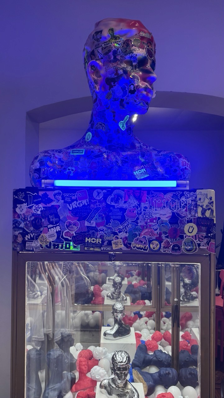 Un busto monumental en azul eléctrico corona el dispositivo: trofeo imposible, altar de un sistema que convirtió el juego en adicción gestionada.